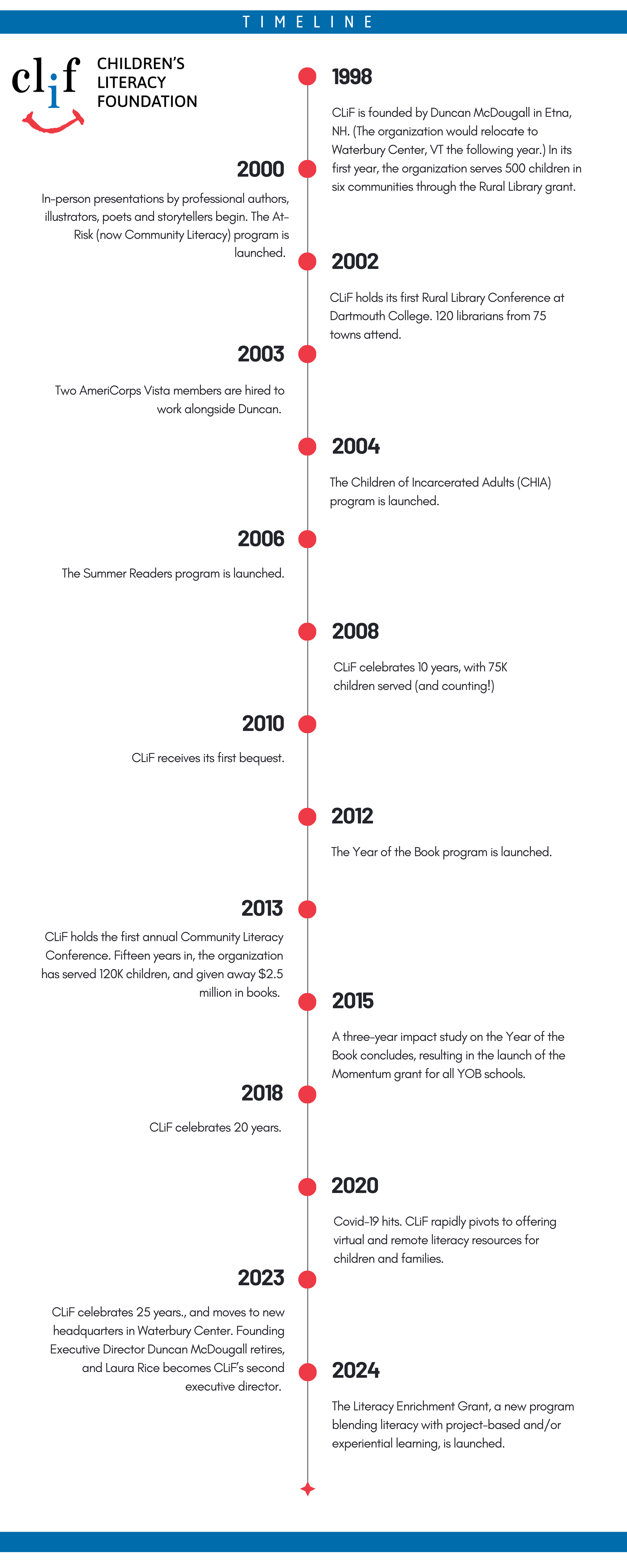The Children’s Literacy Foundation (CLiF) was founded by Duncan McDougall in 1998, with a mission to inspire a love of literacy among under-resourced children in New Hampshire and Vermont. CLiF’s first program launched in March of that year, providing books and presentations to rural libraries.