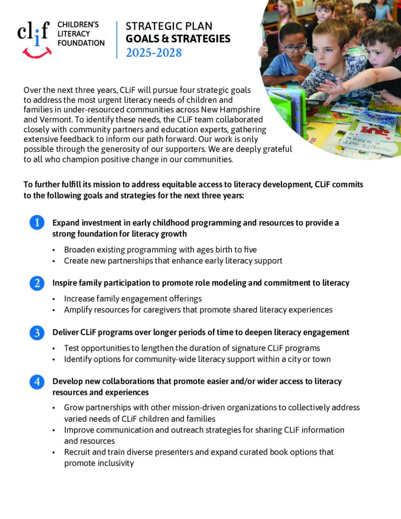 Every three years, the Children’s Literacy Foundation’s Board of Directors and staff develop a current strategic plan with input from CLiF’s stakeholders, community partners, subject matter experts and supporters. The 2025-2028 plan outlines CLiF’s vision and strategic direction, ensuring the Foundation operates as productively and successfully as possible.